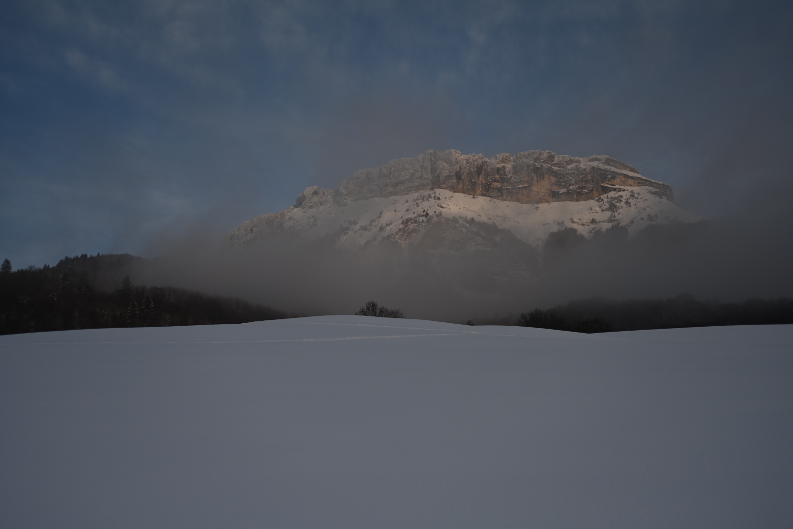 Margériaz dans le soleil couchant d’hiver en descendant de la Féclaz