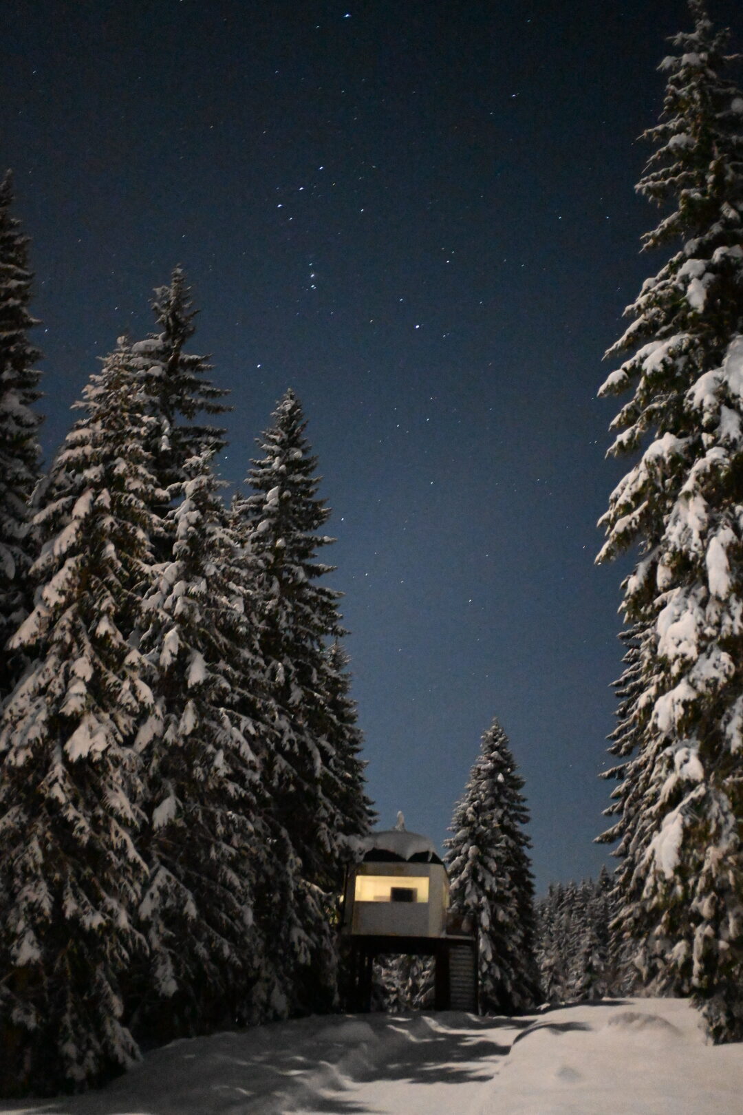 Les étoiles, la lune, des sapins enneigés et une soucoupe
